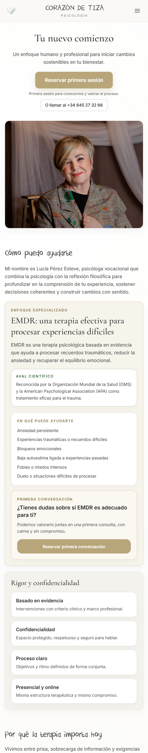 We organized the page as a progressive read: opening proposition, professional introduction, EMDR specialization, and trust-building arguments.